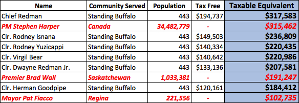 As you can see the chief made slightly more than the prime minister and the four full-year councillors made more than Premier Brad Wall. The crew from Standing Buffalo also made way more than Pat Fiacco, Mayor of Regina at the time (a city with more than 200,000 people).